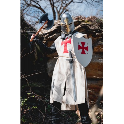 Destral amb mànec de fusta i fulla de DM pintada de color vermell. Opcional: porta destrals de cuir sintètic i corda natural per lligar-la a la cintura. També disponible en color blau i negre.