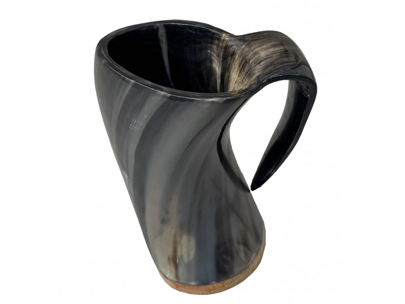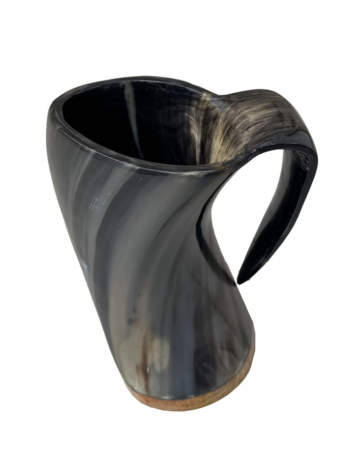 Tassa feta de banya natural de búfal aquàtic. Perfectament polida. És un complement autèntic per a la disfressa medieval. És un element decoratiu. No l'utilitzeu com a recipient per beure. Totes les banyes són diferents en coloració i estampat. Les banyes provenen de fonts ètiques. També disponible en dues mides més petites (ST519 i ST520).