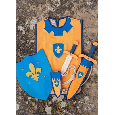 Mittelalterlicher Ritterwappenrock aus Polyester, Baumwollbandkante und Filzkragen, sehr angenehm zu tragen. Schild mit gesticktem Fleur de lis. Erhältlich in 3 Größen. Erhältlich in 3 Größen. Ungefähres Alter: S 3/4 Jahre - M 5/8 Jahre - L 9/12 Jahre.