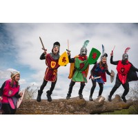 Medieval knight tabard made of polyester, ribbon edging and felt collar, very comfortable to wear. Shield with embroidered lion. It is part of the Kamelot Green collection. Available in 3 sizes. Aproximate ages: S 3/4 years old - M 5/8 years old - L 9/12 years old.