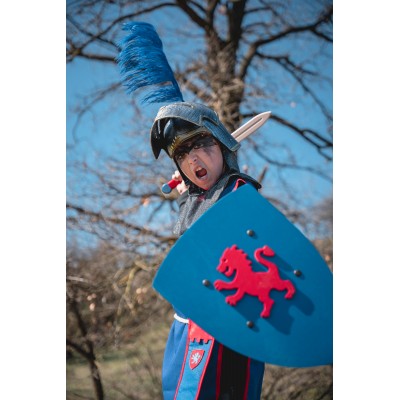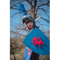 Medieval knight tabard made of polyester, ribbon edging and felt collar, very comfortable to wear. Shield with embroidered lion. It is part of the Kamelot blue collection. Available in 3 sizes. Aproximate ages: S 3/4 years old - M 5/8 years old - L 9/12 years old.