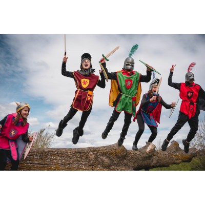 Very durable beech wood sword 65 cms long. Handle covered with suede very pleasant to the touch. Jute pouch with border ribbon, suede castle and natural cord to tie it at the waist. Shield with embroidered lion or dragon.