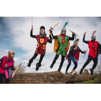 Very durable beech wood sword 50 cms long. Dark brown painted blade. Handle covered with suede very pleasant to the touch. Jute pouch with border ribbon, suede castle and natural cord to tie it at the waist. Shield with embroidered lion or dragon.