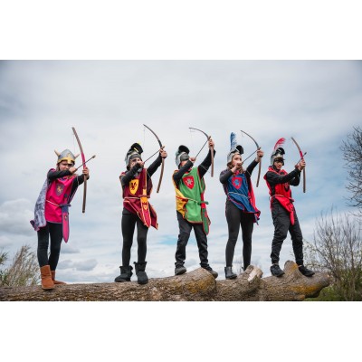 Túnica de caballero medieval hecha de poliéster, ribete y cuello de fieltro, muy cómoda de llevar. Escudo con léon bordado. Forma parte de la colección Kamelot Verde. Disponible en 3 tallas. Edades aproximadas: S 3/4 años - M 5/8 años - L 9/12 años.
