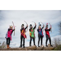 Daga de madera de haya muy resistente. Mango recubierto con serraje de color muy agradable al tacto. Funda de fieltro con ribete, castillo de fieltro y cuerda natural para atarla a la cintura. Escudo con león bordado. Forma parte de la colección Kamelot verde.