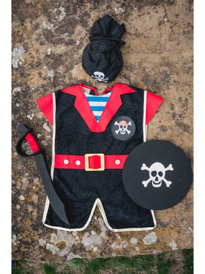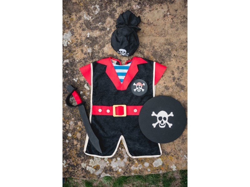 Disfraz tejido fabricado en poliéster para niños de 5 a 8 años. Tiene un escudo de calavera pirata bordado en el pecho. Forma parte de la Colección Pirata Korsar: Escudo Pirata Korsar Softik (ST757) y el Sable Pirata Korsar Softik (ST667).