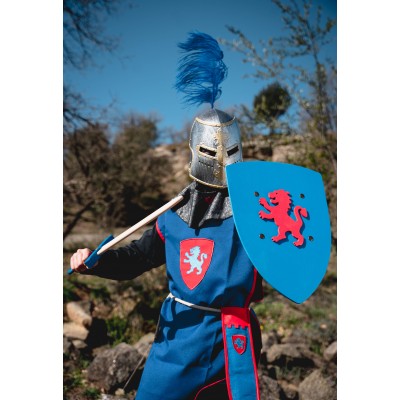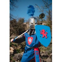 Tunique de chevalier médiéval en polyester, bordure et col en feutre, très agréable à porter. Bouclier avec lion brodé. Il fait partie de la collection Kamelot bleu. Disponible en 3 tailles. Âges approximatifs: S 3/4 ans - M 5/8 ans - L 9/12 ans.