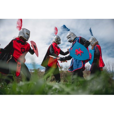 Épée en bois de hêtre très durable. Manche recouvert de suédine très agréable au toucher. Fourreau en feutre avec bordure, château en feutre et corde naturelle pour l'attacher à la taille. Bouclier avec lion brodé. Il fait partie de la collection Kamelot bleu.