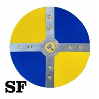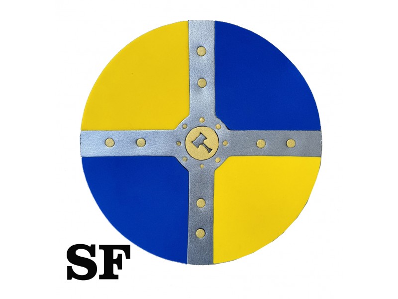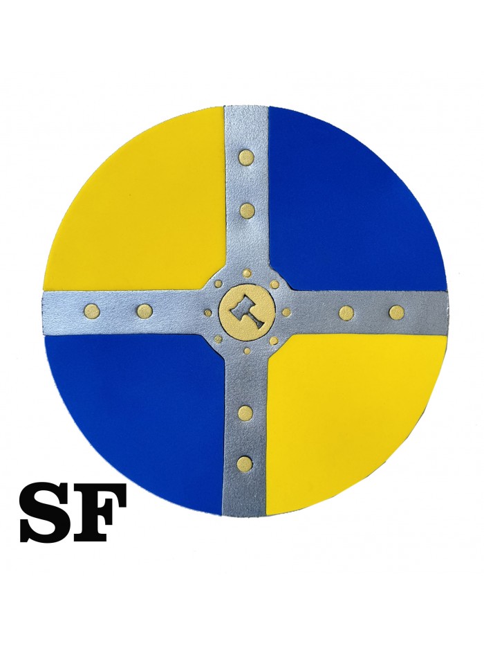 Bouclier viking rond en mousse EVA. Rouge et blanc, orné du marteau de Thor. Poignée en similicuir fixée à l'arrière. Existe aussi en bleu et jaune (ST760).